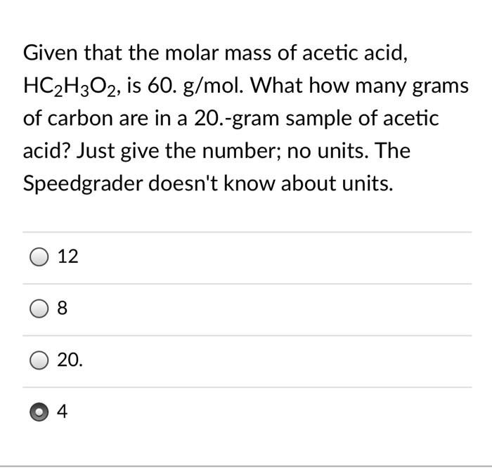 Solved Part 1 1point What Mass Of Acetic Acid Molar Mass 60 05 G Mol Is Required Part 2 1point What Mass Of Sodium Acetate Molar Mass 82 03 G Mol Is Required